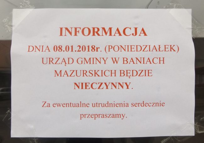 W PONIEDZIAŁEK URZĄD NIECZYNNY! AktualnościAutor: K.E.5 stycznia 2018Uprzejmie informujemy, że zgodnie z ZARZĄDZENIEM NR 106/2017 WÓJTA GMINY BANIE MAZURSKIE z dnia 5 grudnia…