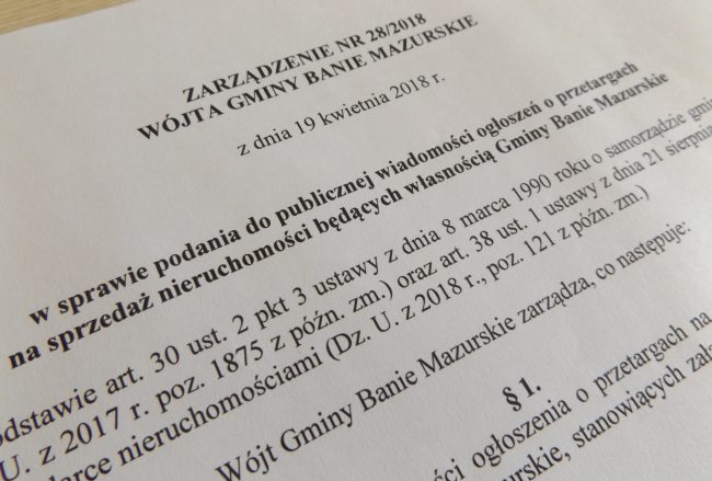 OGŁOSZONO PRZETARGI NA SPRZEDAŻ NIERUCHOMOŚCI AktualnościAutor: K.E.19 kwietnia 2018Ogłoszono Zarządzenie Nr 28/2018 Wójta Gminy Banie Mazurskie z dnia 19 kwietnia 2018 roku w sprawie…