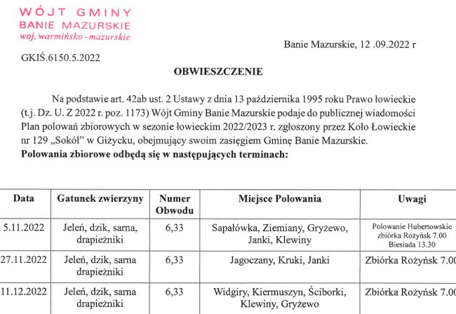 Wójt Gminy Banie Mazurskie podaje do publicznej wiadomości plan polowań zbiorowych w sezonie łowieckim 2022/2023. Szczegóły…