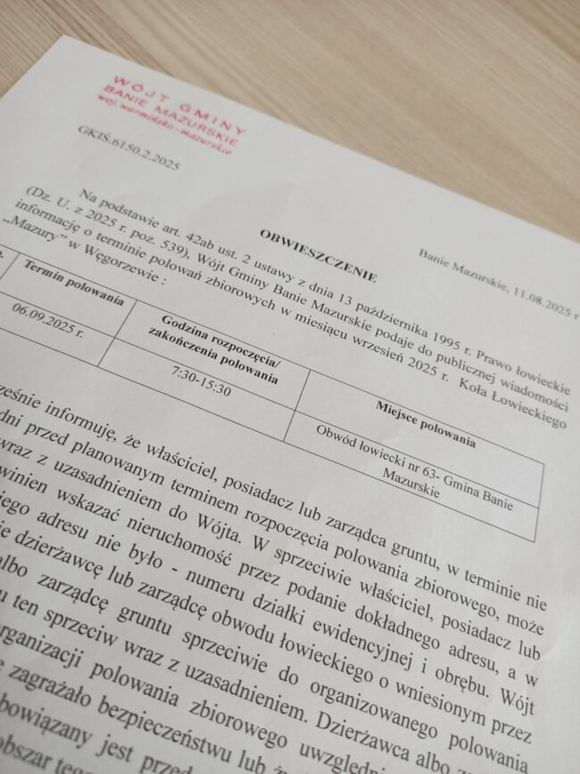 INFORMACJA O TERMINIE POLOWAŃ ZBIOROWYCH W MIESIĄCU WRZEŚNIU 2025 R. KOŁA ŁOWIECKIEGO„MAZURY” W WĘGORZEWIE. AktualnościAutor: Gmina Banie Mazurskie12 sierpnia 2025Obwieszczenie o terminach polowań jednego z kół łowieckich.
