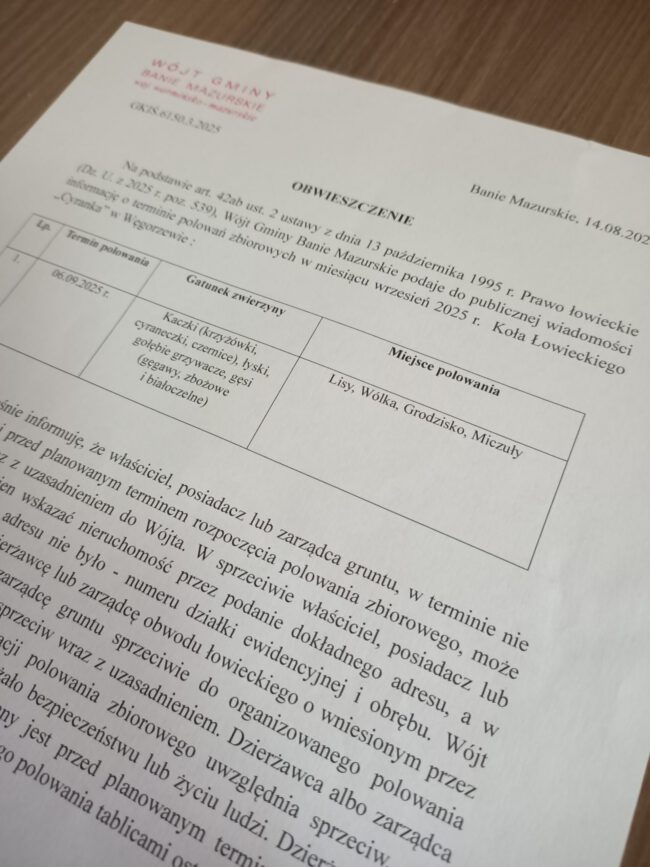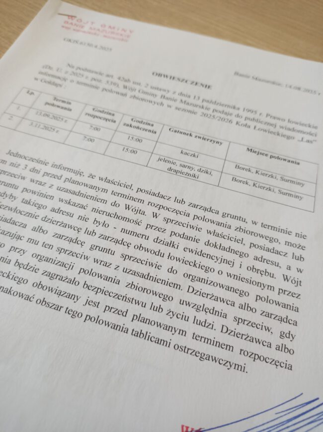 INFORMACJA O TERMINIE POLOWAŃ ZBIOROWYCH W SEZONIE 2025/2026 KOŁA ŁOWIECKIEGO „LAS” W GOŁDAPI.