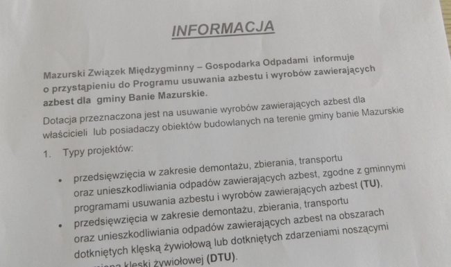 Informacja wytworzona przez Mazurski Związek Międzygminny – Gospodarka Odpadami. Urząd Gminy w Baniach Mazurskich nie ponosi…