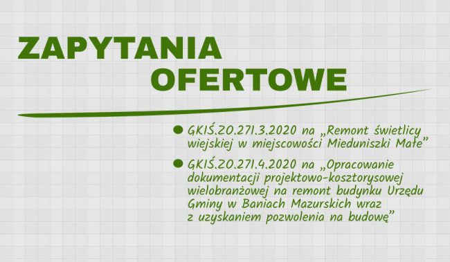 Na stronie Biuletynu Informacji Publicznej Gminy Banie Mazurskie w ostatnim czasie opublikowano kolejne zapytania ofertowe: GKIŚ.ZO.271.3.2020…