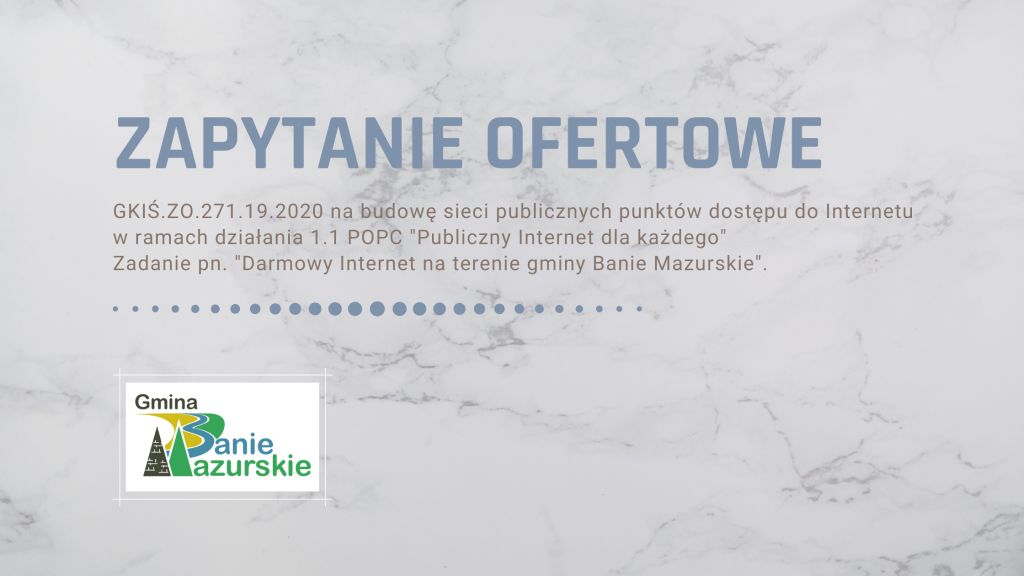 Na stronie internetowej BIP Gminy Banie Mazurskie ogłoszono zapytanie ofertowe GKIŚ.ZO.271.19.2020 na budowę sieci publicznych punktów dostępu do Internetu w ramach działania 1.1 POPC „Publiczny Internet dla każdego” Zadanie pn. „Darmowy Internet na terenie gminy Banie Mazurskie”.