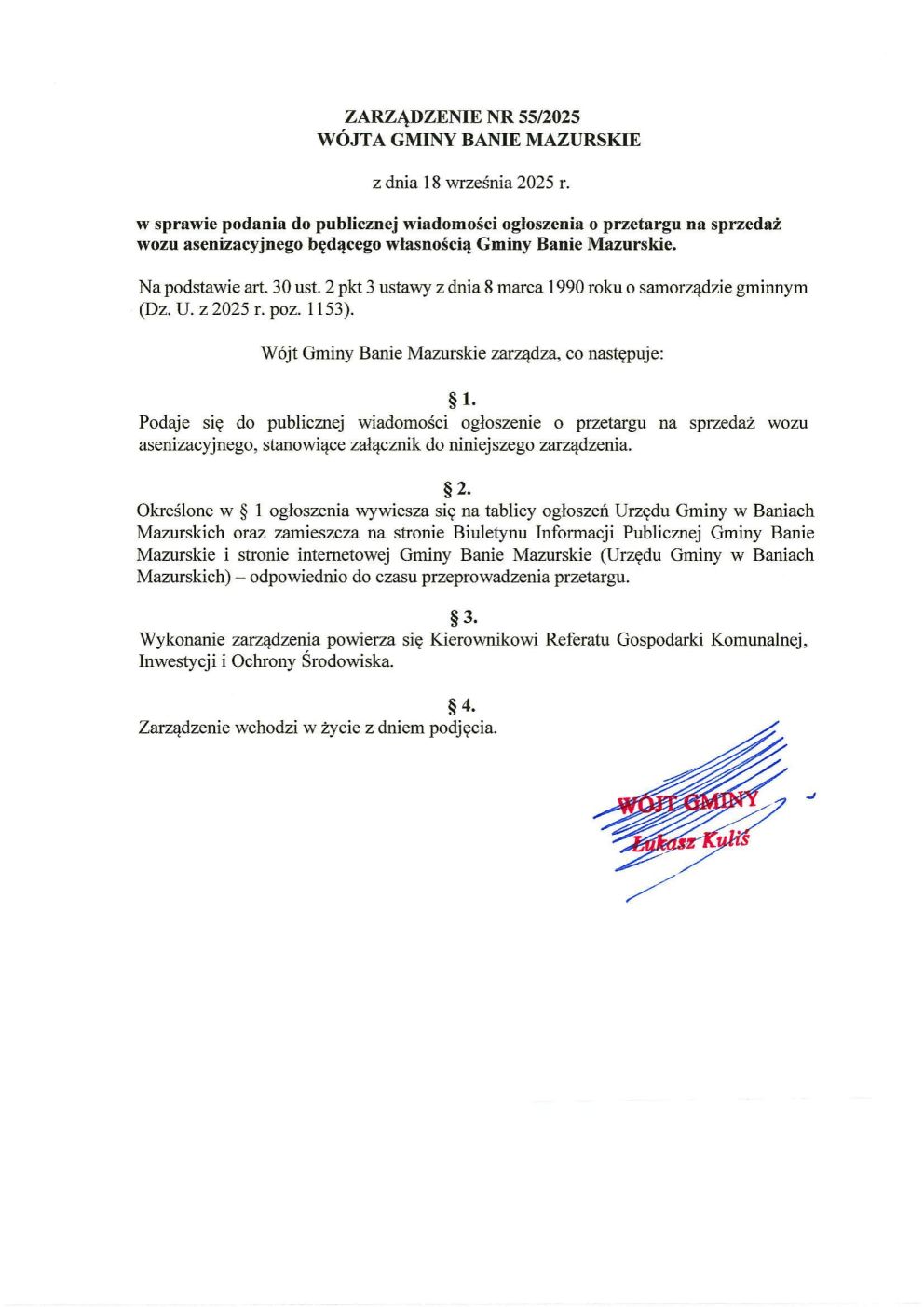 wrz182025 Załącznik do Zarządzenia Przedmiotowe zarządzenie, wraz załącznikiem, jest również dostępne na stronie internetowej BIP Gminy Banie Mazurskie.Kategorie: Aktualności, WażneAutor: P.K.18 września 2025 Udostępnij ten wpis Share on FacebookShare on Facebook Share on XShare on X Share on WhatsAppShare on WhatsApp