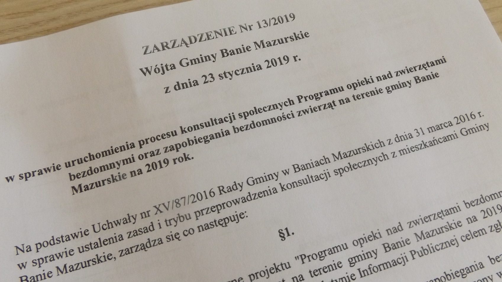 Na stronie Biuletynu Informacji Publicznej Gminy Banie Mazurskie opublikowano Zarządzenie Nr 13/2019 Wójta Gminy Banie Mazurskie z dnia 23 stycznia 2019 r. w sprawie uruchomienia procesu konsultacji społecznych Programu opieki nad zwierzętami bezdomnymi oraz zapobiegania bezdomności zwierząt na terenie gminy Banie Mazurskie na 2019 rok. Oznacza to, że przed wejściem w życie odpowiedniej uchwały w tej sprawie, zostaną przeprowadzone konsultacje społeczne celem doprowadzenia do jak największej efektywności funkcjonowania ww. programu.