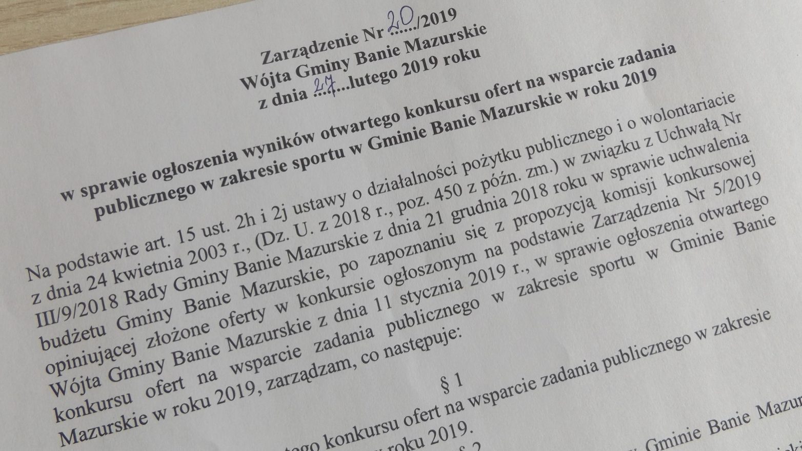 Na stronie Biuletynu Informacji Publicznej Gminy Banie Mazurskie opublikowano Zarządzenie Nr 20/2019 Wójta Gminy Banie Mazurskie z dnia 27 lutego 2019 roku w sprawie ogłoszenia wyników otwartego konkursu ofert na wsparcie zadania publicznego w zakresie sportu w Gminie Banie Mazurskie w roku 2019.