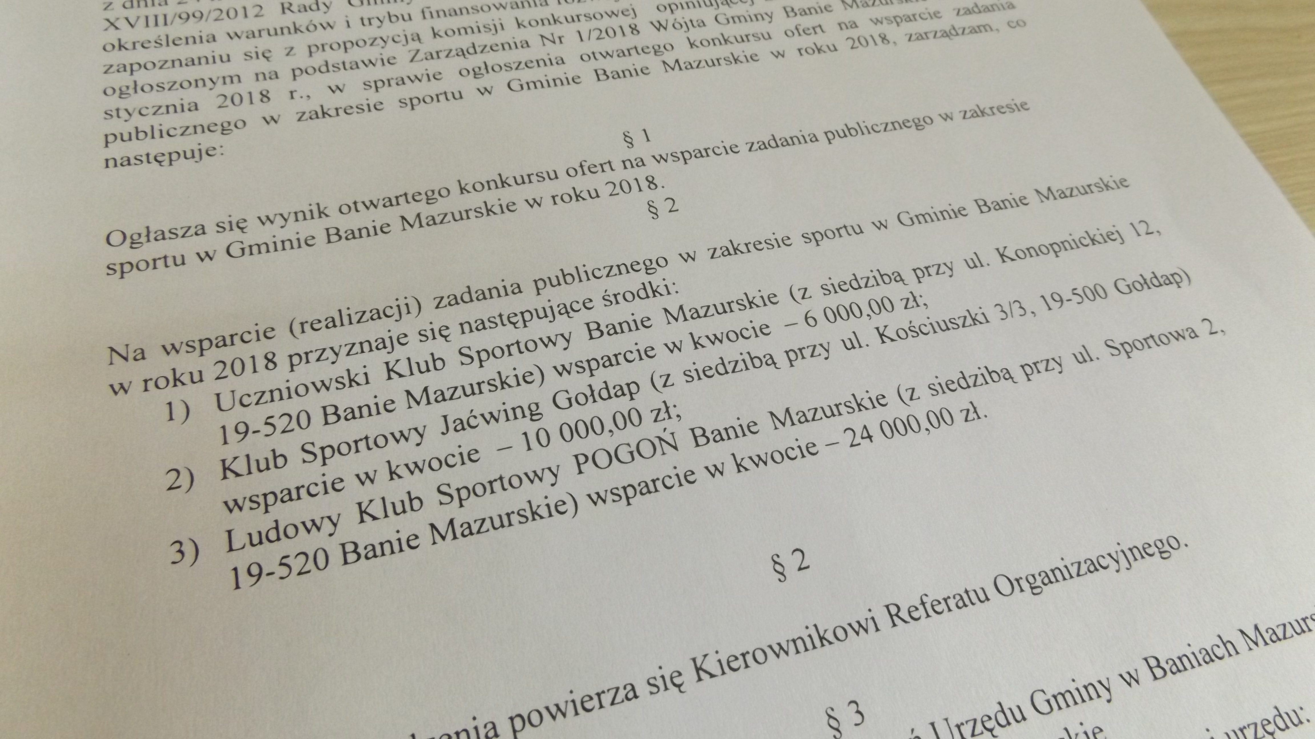 Ogłoszono wyniki konkursu ofert w na wsparcie zadania publicznego w zakresie sportu w Gminie Banie Mazurskie w roku 2018, które prezentują się następująco: