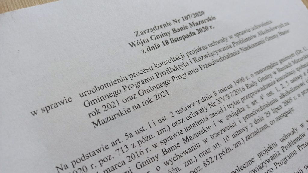 Na stronie internetowej BIP Gminy Banie Mazurskie opublikowano Zarządzenie Nr 107/2020 Wójta Gminy Banie Mazurskie z dnia 18 listopada 2020 r. w sprawie uruchomienia procesu konsultacji projektu uchwały w sprawie uchwalenia Gminnego Programu Profilaktyki i Rozwiązywania Problemów Alkoholowych na rok 2021 oraz Gminnego Programu Przeciwdziałania Narkomanii Gminy Banie Mazurskie na rok 2021.