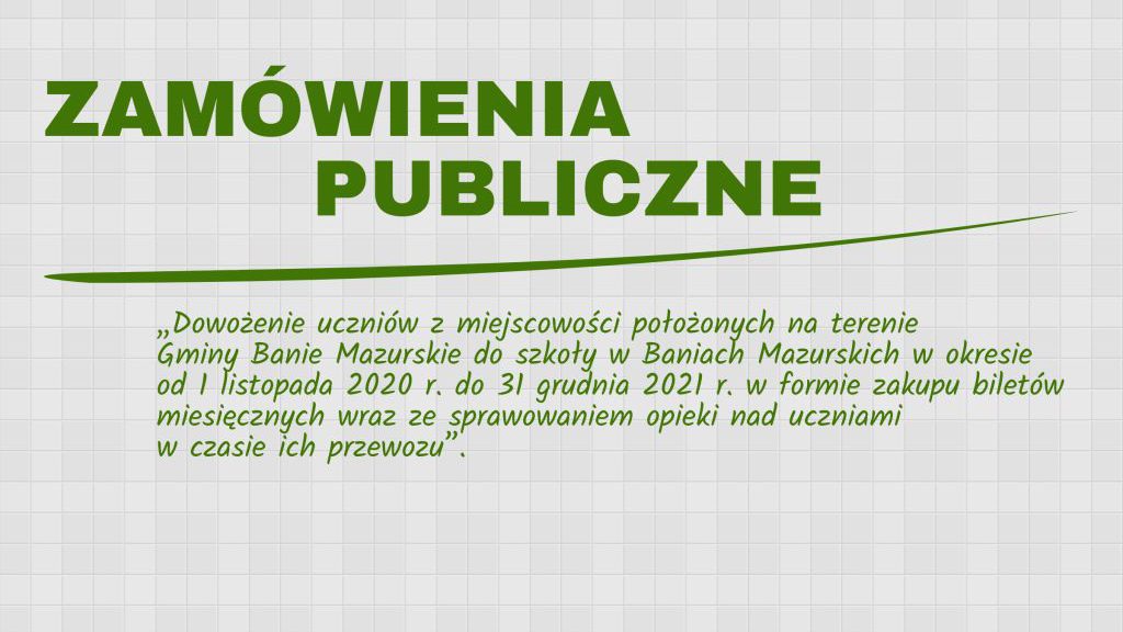 Na stronie internetowej BIP Gminy Banie Mazurskie opublikowano ogłoszenie o zamówieniu na „Dowożenie uczniów z miejscowości położonych na terenie Gminy Banie Mazurskie do szkoły w Baniach Mazurskich w okresie od 1 listopada 2020 r. do 31 grudnia 2021 r. w formie zakupu biletów miesięcznych wraz ze sprawowaniem opieki nad uczniami w czasie ich przewozu”.