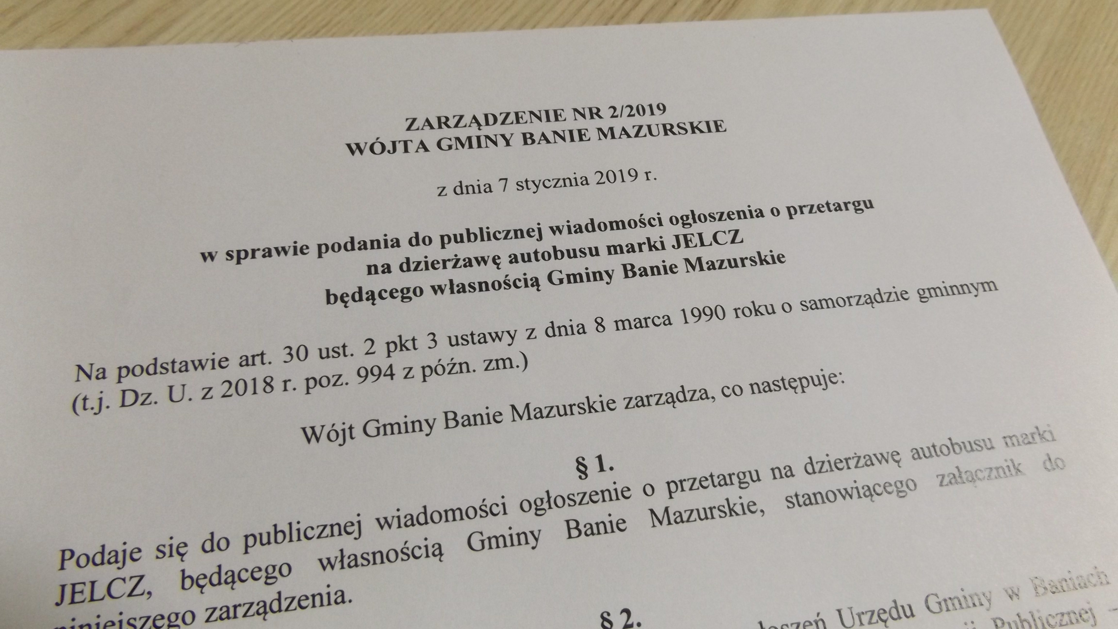 Opublikowano Zarządzenie Nr 2/2019 Wójta Gminy Banie Mazurskie z dnia 7 stycznia 2019 r. w sprawie podania do publicznej wiadomości ogłoszenia o przetargu na dzierżawę autobusu marki JELCZ będącego własnością Gminy Banie Mazurskie.