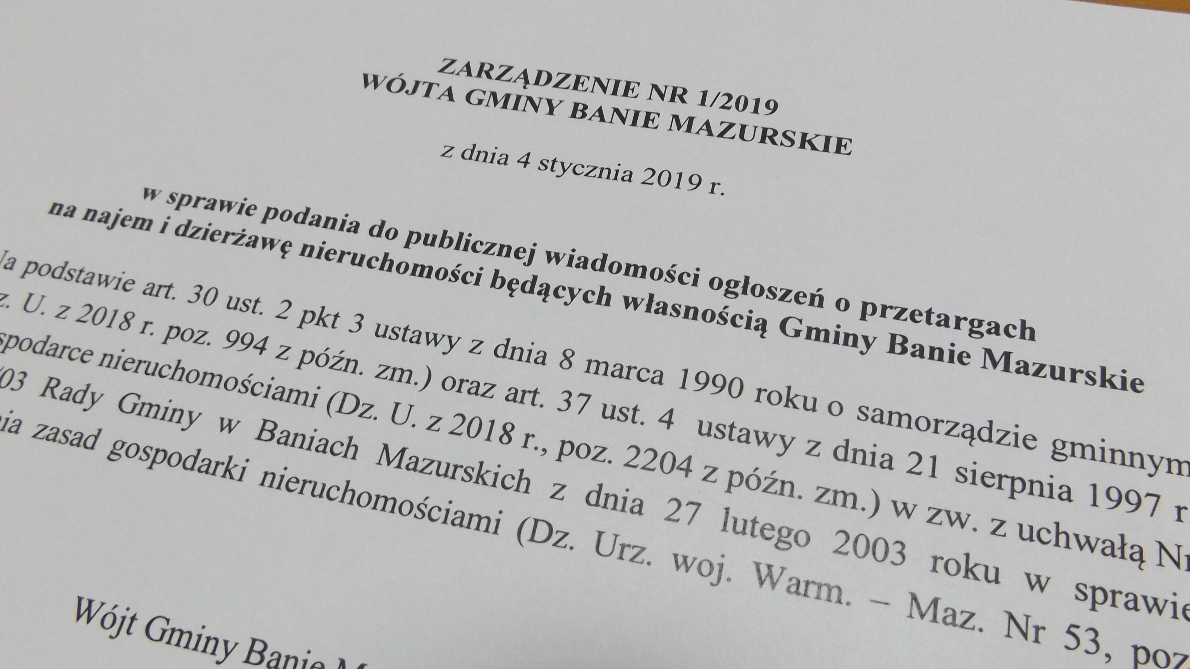Na stronie Biuletynu Informacji Publicznej opublikowano Zarządzenie Nr 1/2019 Wójta Gminy Banie Mazurskie z dnia 4 stycznia 2019 r. w sprawie podania do publicznej wiadomości ogłoszeń o przetargach na najem i dzierżawę nieruchomości będących własnością Gminy Banie Mazurskie.