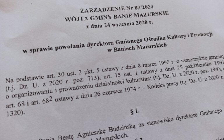 Rozstrzygnięto wcześniej ogłoszony konkurs na stanowisko dyrektora GOKiP w Baniach Mazurskich. Zgodnie z Zarządzeniem Nr 83/2020…