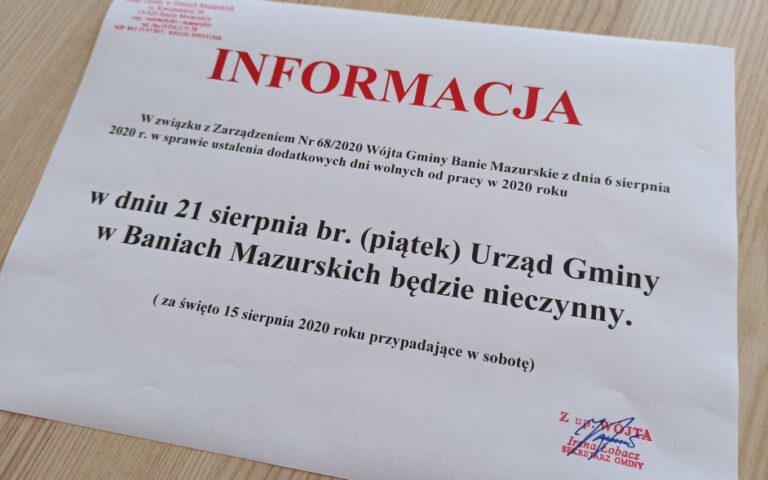 SZANOWNY MIESZKAŃCU, JUTRO (21.08) URZĄD BĘDZIE NIECZYNNY