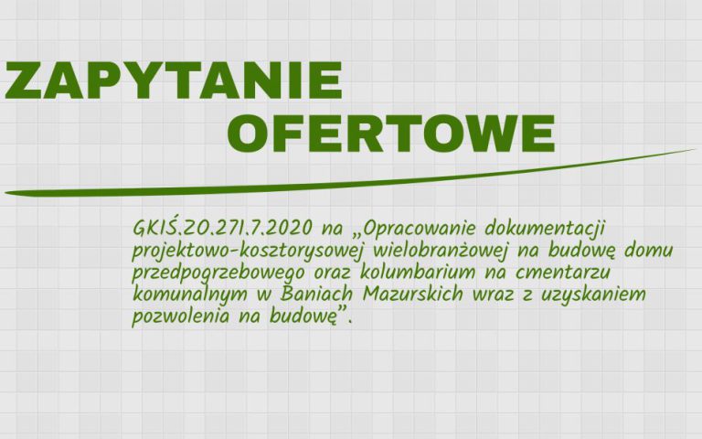 Na stronie internetowej BIP Gminy Banie Mazurskie ogłoszono zapytanie ofertowe GKIŚ.ZO.271.7.2020 na „Opracowanie dokumentacji projektowo-kosztorysowej wielobranżowej…