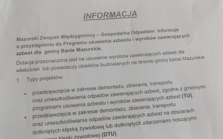 Informacja wytworzona przez Mazurski Związek Międzygminny – Gospodarka Odpadami. Urząd Gminy w Baniach Mazurskich nie ponosi…