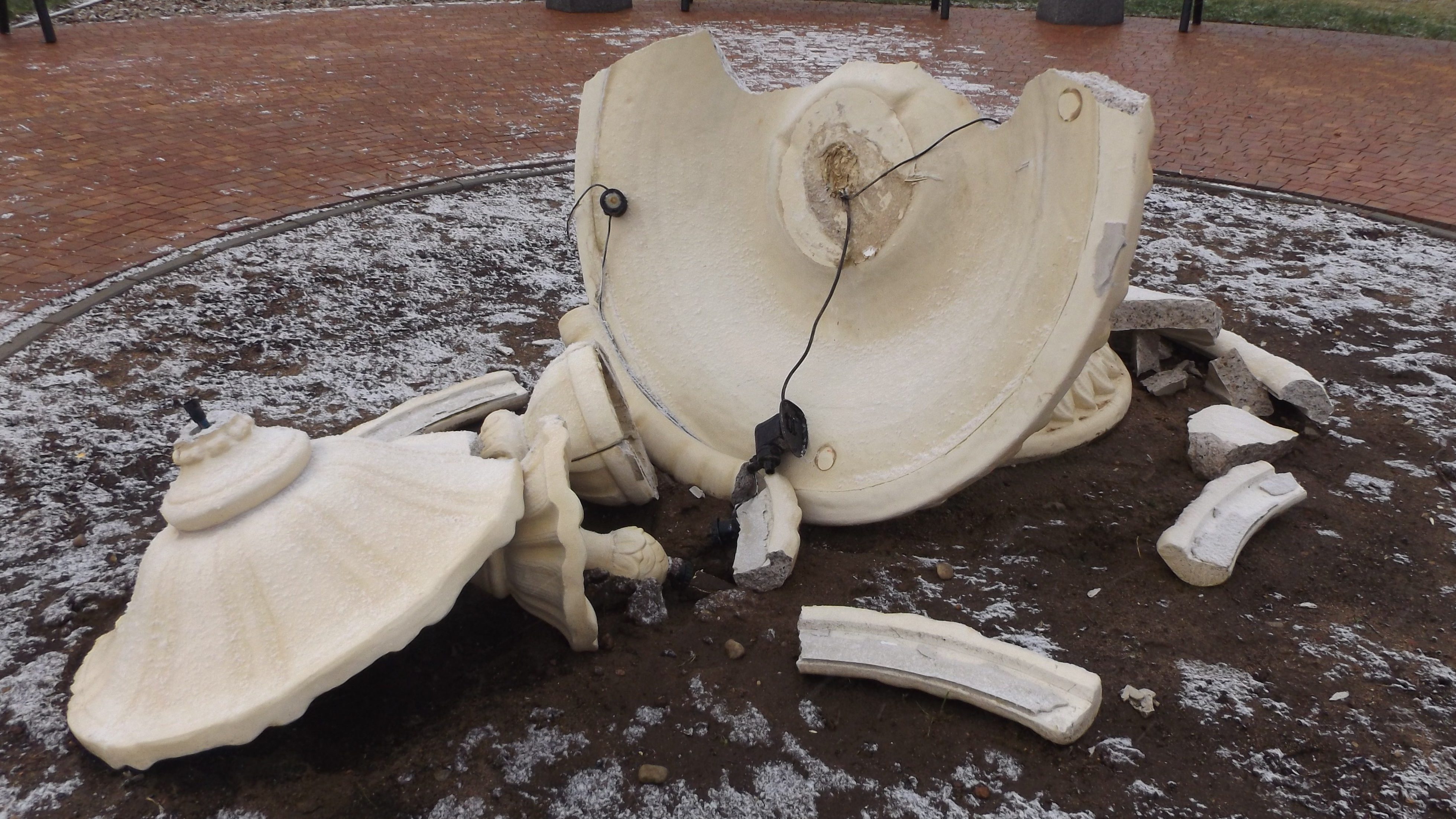 W jednym z ostatnich kilku dni całkowicie zniszczona została fontanna zdobiąca plac. Wandal(-e) z premedytacją ją zdemolował (-li), nie szanując dobra wspólnego, które przecież powstało z myślą o nas wszystkich.