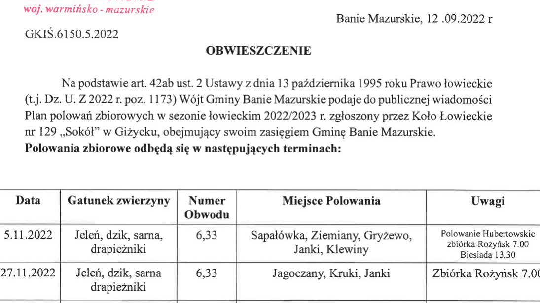 Wójt Gminy Banie Mazurskie podaje do publicznej wiadomości plan polowań zbiorowych w sezonie łowieckim 2022/2023.