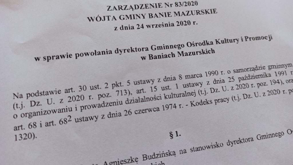 Rozstrzygnięto wcześniej ogłoszony konkurs na stanowisko dyrektora GOKiP w Baniach Mazurskich. Zgodnie z Zarządzeniem Nr 83/2020 Wójta Gminy Banie Mazurskie z dnia 24 września 2020 r. w sprawie powołania dyrektora Gminnego Ośrodka Kultury i Promocji w Baniach Mazurskich funkcję tę przez najbliższych 5 lat pełnić będzie Pani Beata Agnieszka Budzińska.