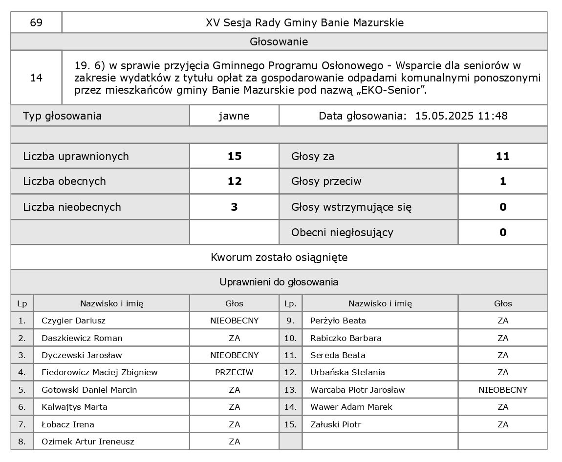 Choć inicjatorem programu był wójt Łukasz Kuliś, to pomysł ten musieli poprzeć radni Rady Gminy Banie Mazurskie. Tak też stało się w trakcie obrad, które miały miejsce 15 maja br. Wówczas, na 12 obecnych, „za” podjęciem Uchwały Nr XV/101/2025 Rady Gminy Banie Mazurskie z dnia 15 maja 2025 r. w sprawie przyjęcia Gminnego Programu Osłonowego – Wsparcie dla seniorów w zakresie wydatków z tytułu opłat za gospodarowanie odpadami komunalnymi ponoszonymi przez mieszkańców gminy Banie Mazurskie pod nazwą „EKO-Senior” zagłosowało 11 radnych, 1 był przeciw (wyciąg z głosowania poniżej). Tym samym, dzięki właściwej współpracy organów (wójta i rady gminy), wspomniany program mógł wejść w życie.