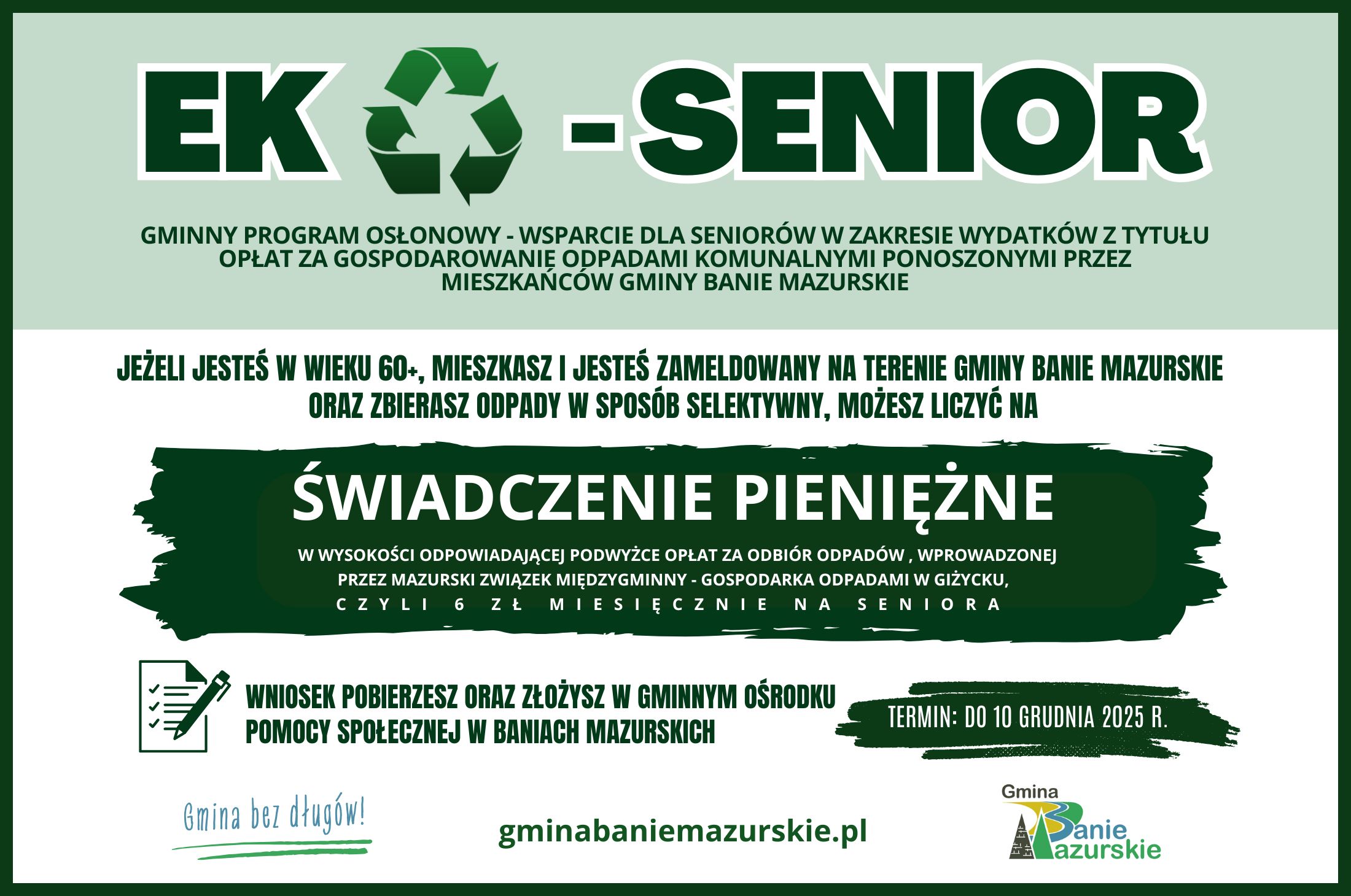 - Uchwała Nr XV/101/2025 Rady Gminy Banie Mazurskie z dnia 15 maja 2025 r. w sprawie przyjęcia Gminnego Programu Osłonowego – Wsparcie dla seniorów w zakresie wydatków z tytułu opłat za gospodarowanie odpadami komunalnymi ponoszonymi przez mieszkańców gminy Banie Mazurskie pod nazwą „EKO-Senior”