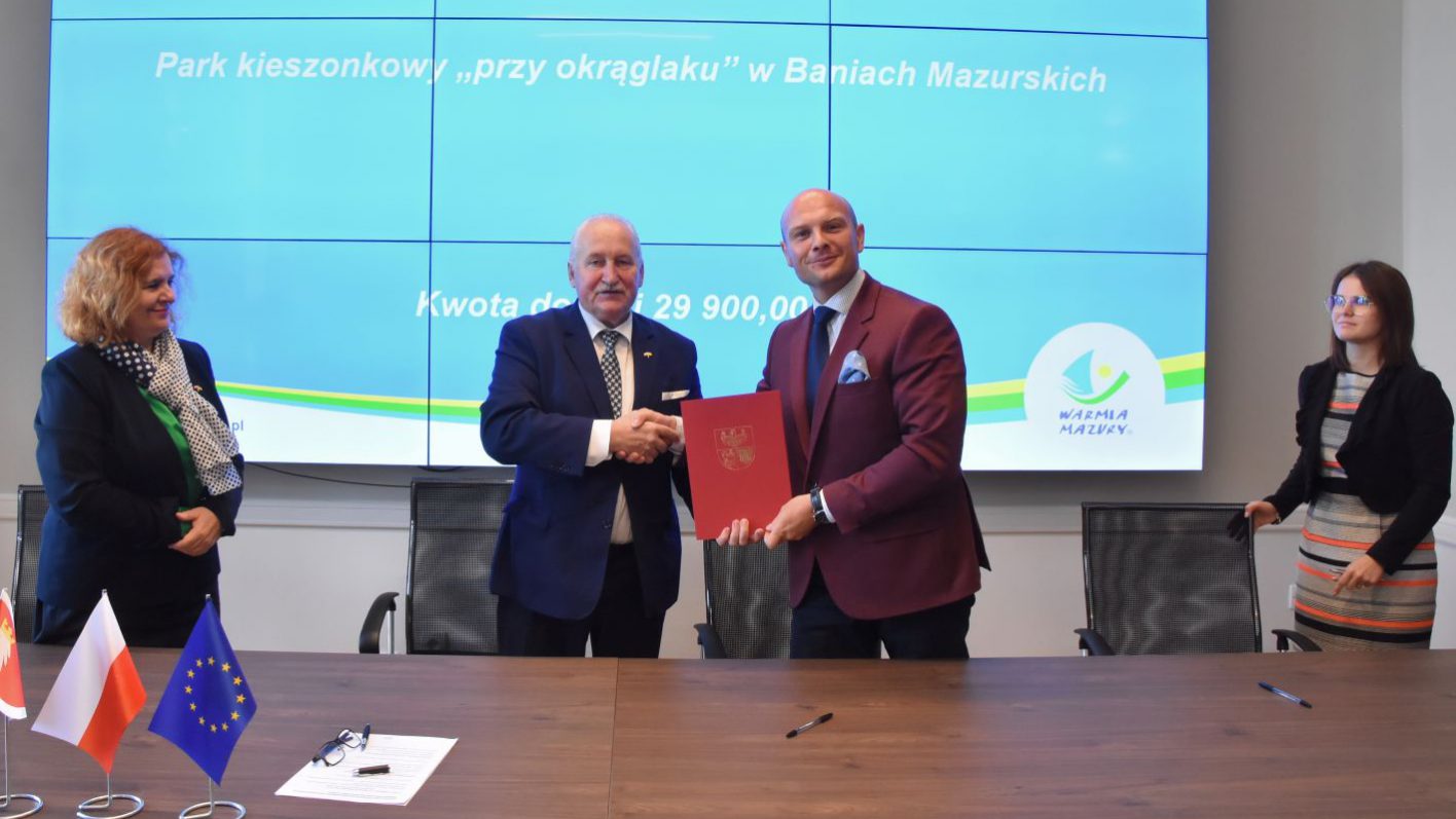 W ubiegłym tygodniu wójt Łukasz Kuliś, wspólnie ze skarbnik gminy Sandrą Anną Borowską, podpisali umowę zapewniającą dofinansowanie inwestycji, polegającej na budowie parku kieszonkowego przy skrzyżowaniu ulic Konopnickiej i Kościuszki w Baniach Mazurskich.