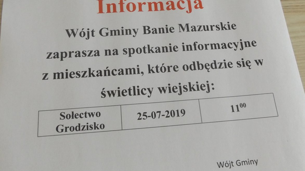 Wójt gminy Łukasz Kuliś zaprasza mieszkańców sołectwa Grodzisko na spotkanie informacyjne, które odbędzie się dnia 25.07.2019 r. o godz. 11:00 w świetlicy wiejskiej w Grodzisku.