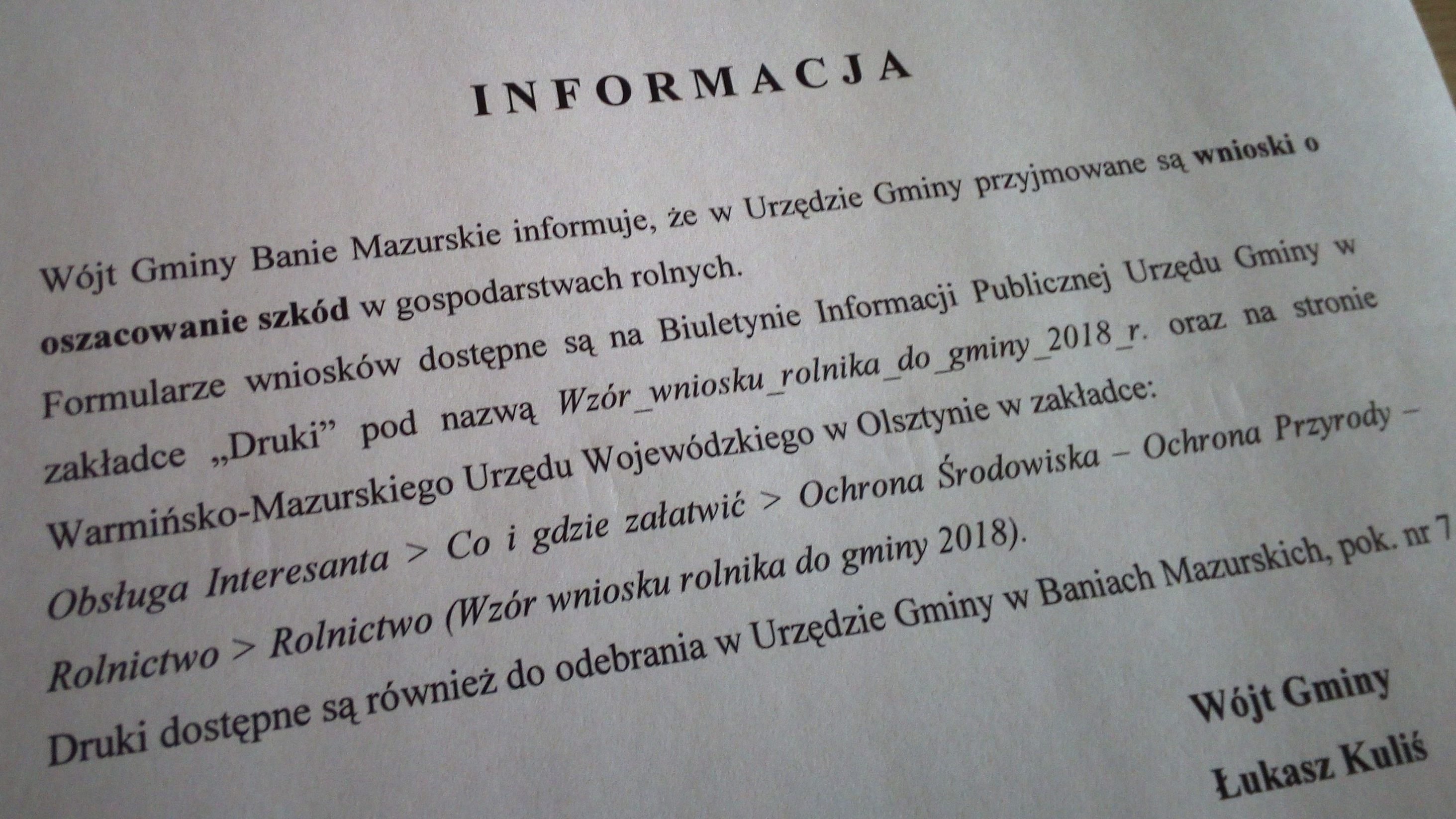 Wójt Gminy Banie Mazurskie informuje, że w Urzędzie Gminy przyjmowane są wnioski o oszacowanie szkód w gospodarstwach rolnych.