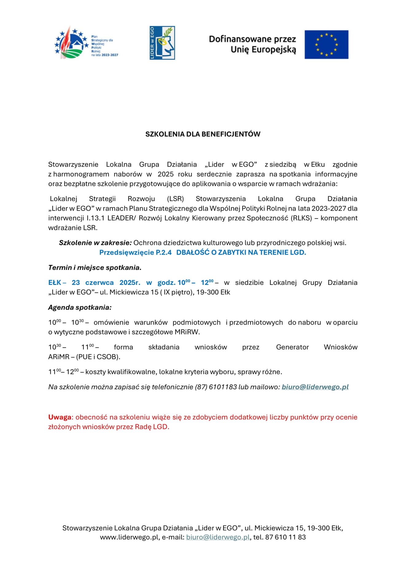 cze172025 Informacja autorstwa Stowarzyszenia Lokalna Grupa Działania „Lider w EGO”. Kategorie: Aktualności, WażneAutor: P.K.17 czerwca 2025 Udostępnij ten wpis Share on FacebookShare on Facebook Share on XShare on X Share on WhatsAppShare on WhatsApp