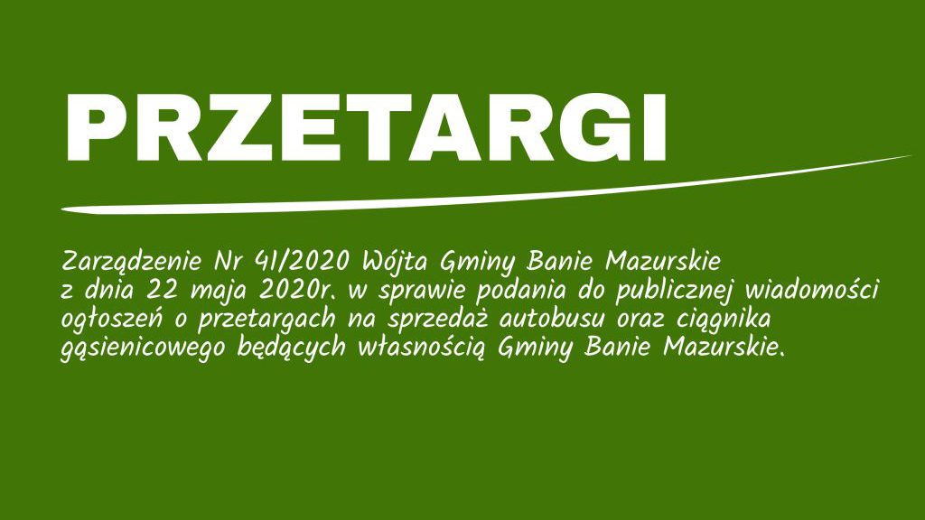 Na stronie internetowej BIP Gminy Banie Mazurskie zamieszczono Zarządzenie Nr 41/2020 Wójta Gminy Banie Mazurskie z dnia 22 maja 2020 roku w sprawie podania do publicznej wiadomości ogłoszeń o przetargach na sprzedaż autobusu oraz ciągnika gąsienicowego będących własnością Gminy Banie Mazurskie.