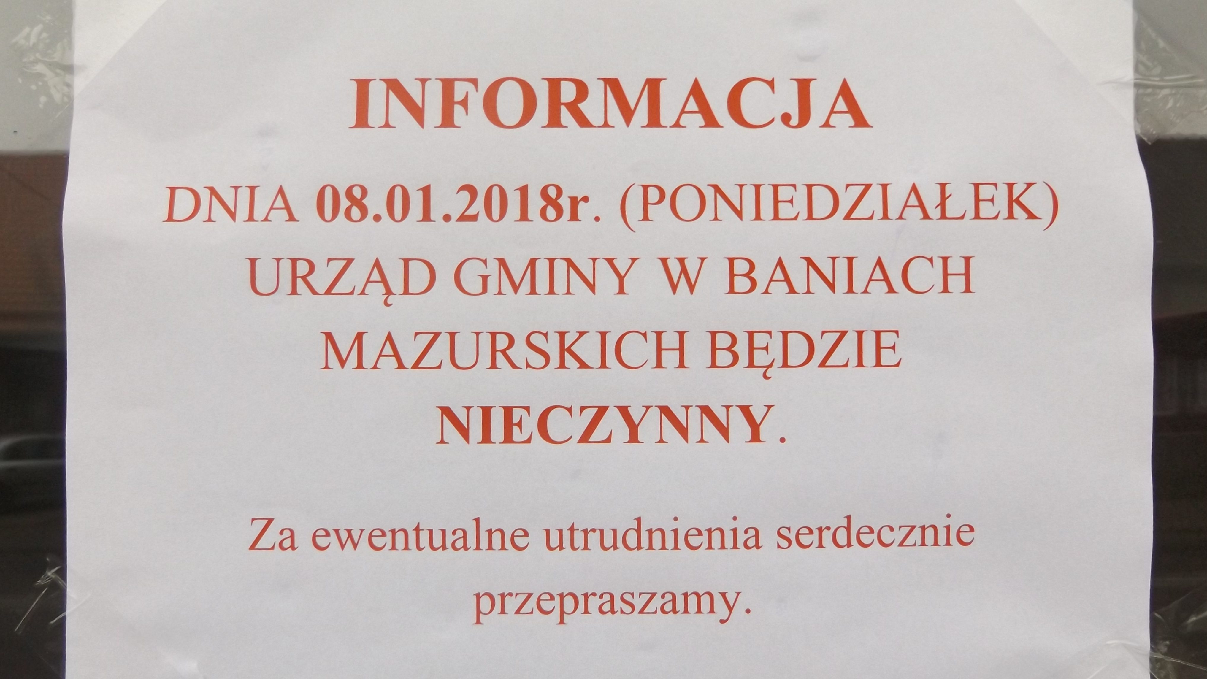 Uprzejmie informujemy, że zgodnie z ZARZĄDZENIEM NR 106/2017 WÓJTA GMINY BANIE MAZURSKIE z dnia 5 grudnia 2017r. w sprawie ustalenia dodatkowych dni wolnych od pracy w 2018 roku, dnia 8.01.2018r. (poniedziałek) Urząd Gminy w Baniach Mazurskich będzie nieczynny za sprawą przypadającego dodatkowego dnia wolnego od pracy za święto (6 stycznia) przypadające w sobotę.
