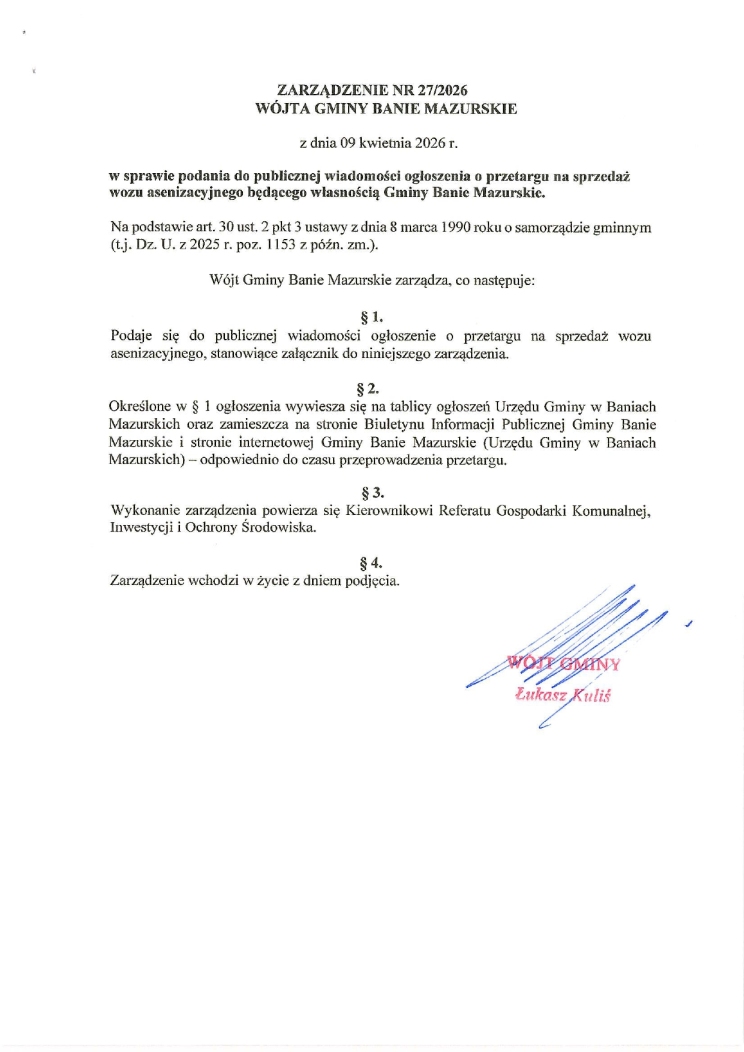 kwi92026 Załącznik do Zarządzenia Przedmiotowe zarządzenie, wraz załącznikiem, jest również dostępne na stronie internetowej BIP Gminy Banie Mazurskie.Kategorie: Aktualności, WażneAutor: P.K.9 kwietnia 2026 Udostępnij ten wpis Share on FacebookShare on Facebook Share on XShare on X Share on WhatsAppShare on WhatsApp