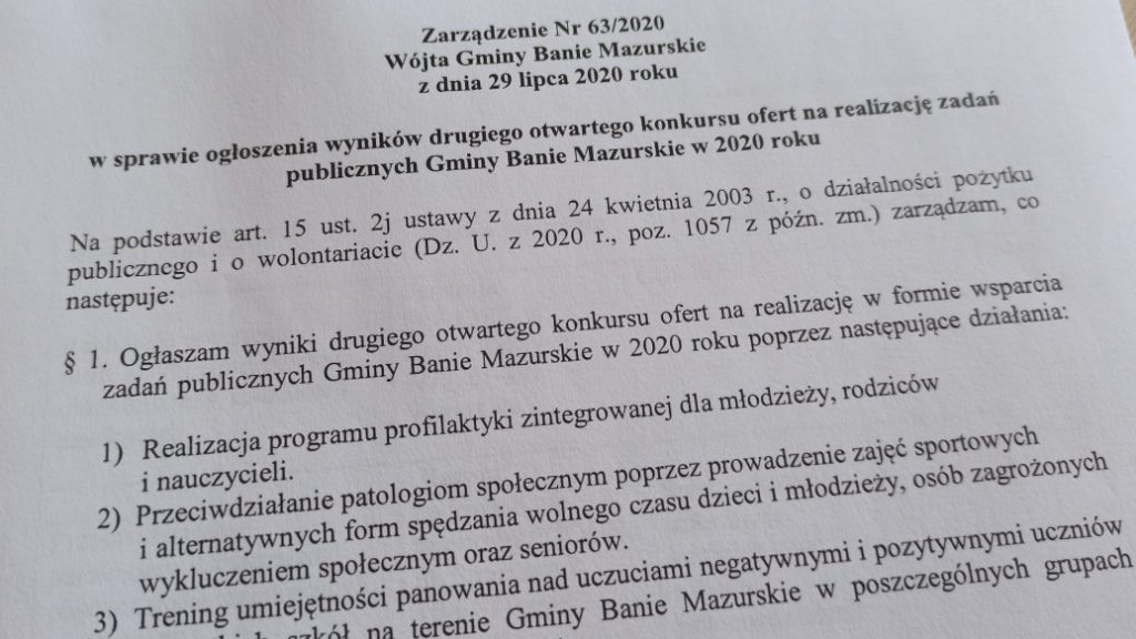 Na stronie internetowej BIP Gminy Banie Mazurskie opublikowano Zarządzenie Nr 63/2020 Wójta Gminy Banie Mazurskie z dnia 29 lipca 2020 roku w sprawie ogłoszenia wyników drugiego otwartego konkursu ofert na realizację zadań publicznych Gminy Banie Mazurskie w 2020 roku.