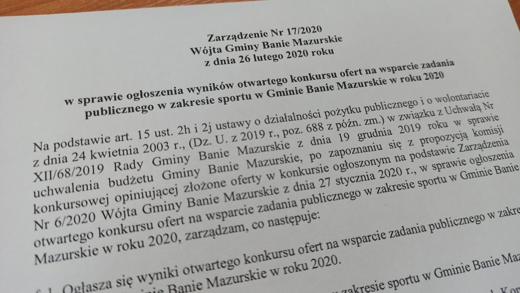Na stronie internetowej BIP Gminy Banie Mazurskie opublikowano Zarządzenie Nr 17/2020 Wójta Gminy Banie Mazurskie z dnia 26 lutego 2020 roku w sprawie ogłoszenia wyników otwartego konkursu ofert na wsparcie zadania publicznego w zakresie sportu w Gminie Banie Mazurskie w roku 2020.