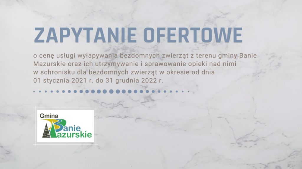 Na stronie internetowej BIP Gminy Banie Mazurskie zamieszczono zapytanie ofertowe GKIŚ.ZO.271.18.2020 o cenę usługi wyłapywania bezdomnych zwierząt z terenu gminy Banie Mazurskie oraz ich utrzymywanie i sprawowanie opieki nad nimi w schronisku dla bezdomnych zwierząt w okresie od dnia 01 stycznia 2021 r. do 31 grudnia 2022 r.