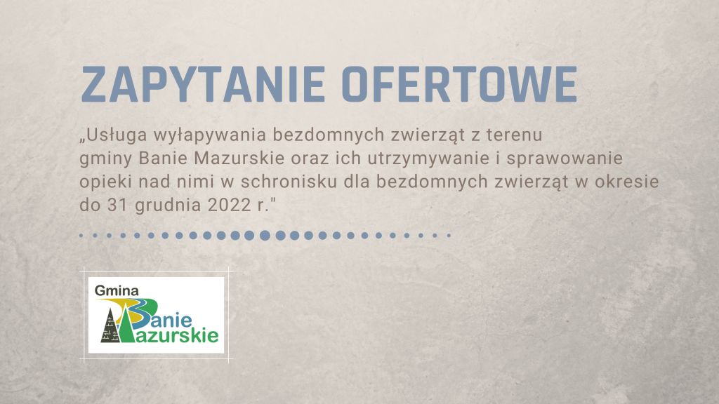 Gmina Banie Mazurskie opublikowała zapytanie ofertowe GKIŚ.ZO.271.3.2021 pn. „Usługa wyłapywania bezdomnych zwierząt z terenu gminy Banie Mazurskie oraz ich utrzymywanie i sprawowanie opieki nad nimi w schronisku dla bezdomnych zwierząt w okresie do 31 grudnia 2022 r.”.